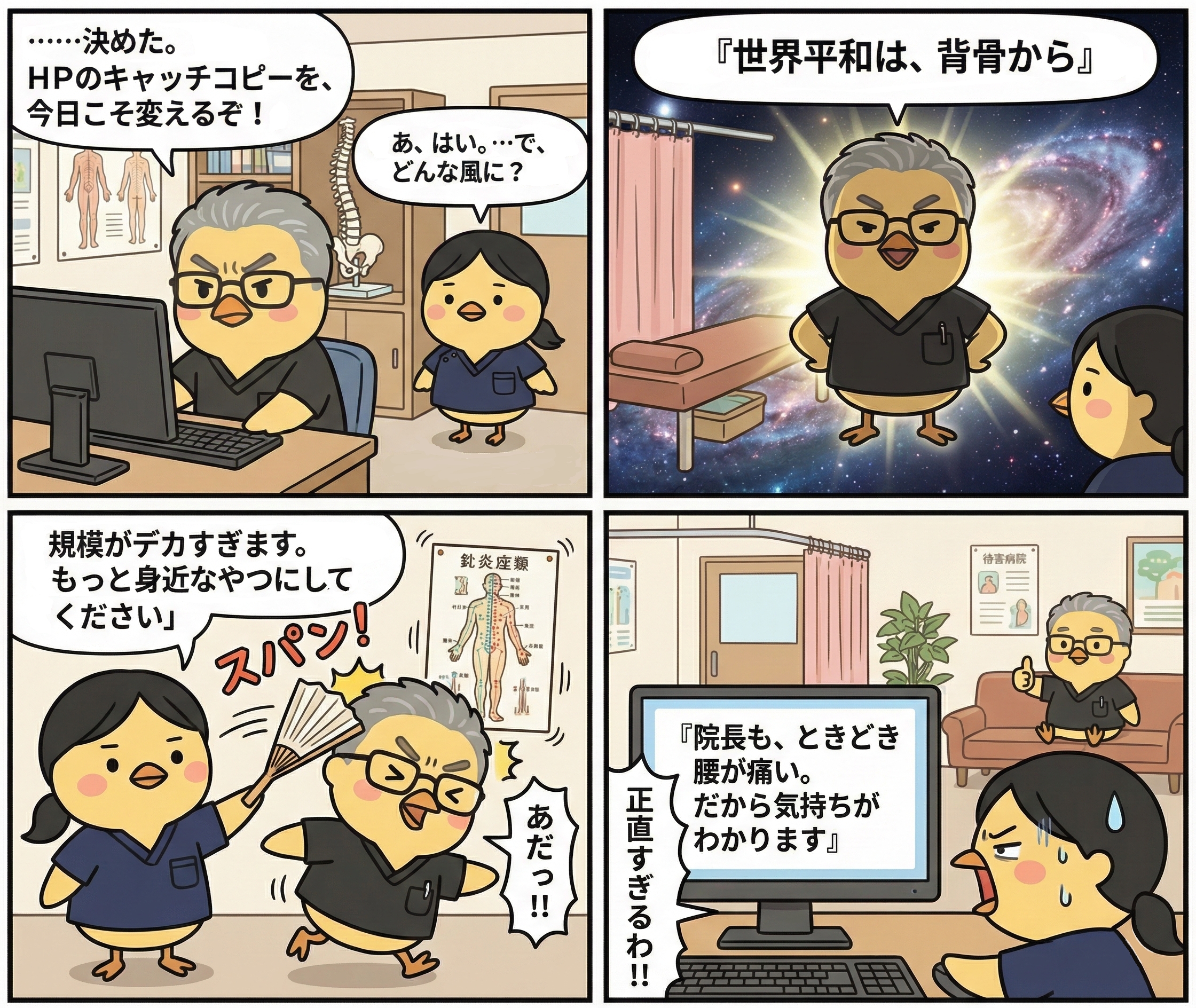 【4コマ漫画】HPのキャッチコピー、どうする? 公開日:2026年1月9日 4コマ漫画 「世界平和」という壮大な理想から、「院長も腰が痛い」という切実な現実へ…。 振れ幅が凄すぎます、院長!!😂 でも、腰が痛い先生の方が、痛みを分かってくれそうな気もしますよね?(笑) 四コマ漫画 タグ 4コマ漫画 あるある オリジナル漫画 キャッチコピー コミック 仕事 接骨院 整体 日常 漫画 関連記事 【漫画】院長の職業病が重症すぎる件…骨格模型のポーズ(4コマ漫画)院長の特殊能力(4コマ漫画) 投稿ナビゲーション 【漫画】院長の職業病が重症すぎる件…