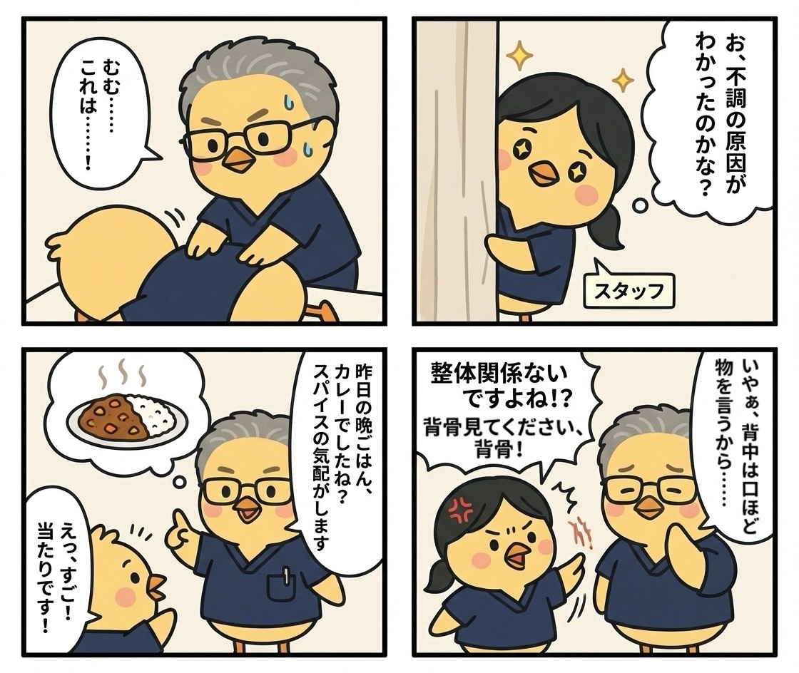 院長の特殊能力(4コマ漫画) 公開日:2025年12月10日 未分類 「当院の院長は、背中を見ただけで『あること』が分かってしまう特殊能力の持ち主です。 真剣な眼差しで患部に触れる院長。ついに不調の根本原因を発見か!? ……と思いきや、飛び出した言葉にスタッフもあきれ顔。 院長の意外すぎる(そしてちょっと役に立たない?)能力をご覧ください!」 院長の特殊能力 タグ 大船駅 大船駅前整体 整体 関連記事 筋膜施術でめまいを根本から解消!The initial medical interview is very important for treatment. ^^Fascia treatment relieves headaches.『たまや~』『かぎや~』筋膜施術で筋肉の緊張をほぐし血行を改善し頭痛を解消。Fascial treatment treats knee pain from the root! 投稿ナビゲーション 🍃大船駅前整体院から空き状況のお知らせ🍃(9/26)